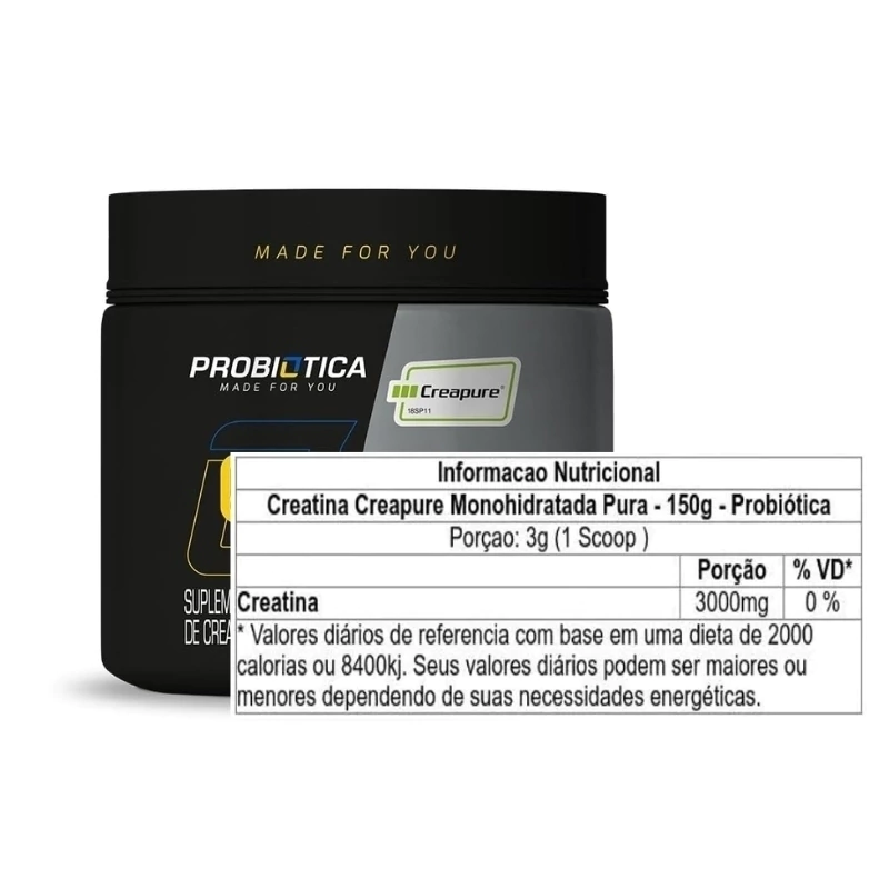 A CREATINA Probiótica, traz o aminoácido creatina na concentração e pureza da exclusiva tecnologia alemã CREAPURE®. A CREATINA auxilia no aumento do desempenho físico durante exercícios repetidos de curta duração e alta intensidade, além de ajudar a complementar os estoques endógenos de creatina.